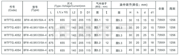 B-变压器用;D-单体瓷绝缘;F-复合瓷绝缘;J-有附加绝缘:W-防污;L-穿缆(或可装电流互感器),套管型号中“广前 的数字表示额定电压(KV ) 后的数字表示额定电流(A)。