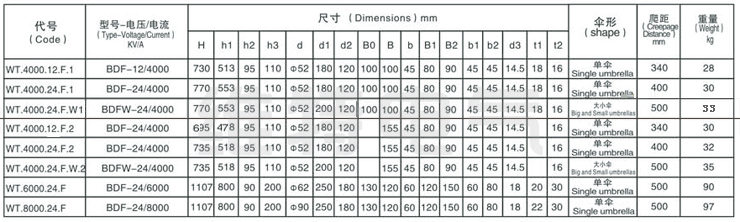 B-变压器用;D-单体瓷绝缘;F-复合瓷绝缘;J-有附加绝缘:W-防污;L-穿缆(或可装电流互感器),套管型号中“广前 的数字表示额定电压(KV ) 后的数字表示额定电流(A)。