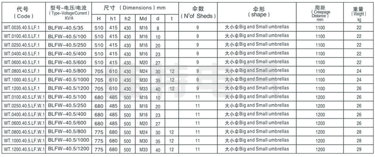 B-变压器用;D-单体瓷绝缘;F-复合瓷绝缘;J-有附加绝缘:W-防污;L-穿缆(或可装电流互感器),套管型号中“广前 的数字表示额定电压(KV ) 后的数字表示额定电流(A)。